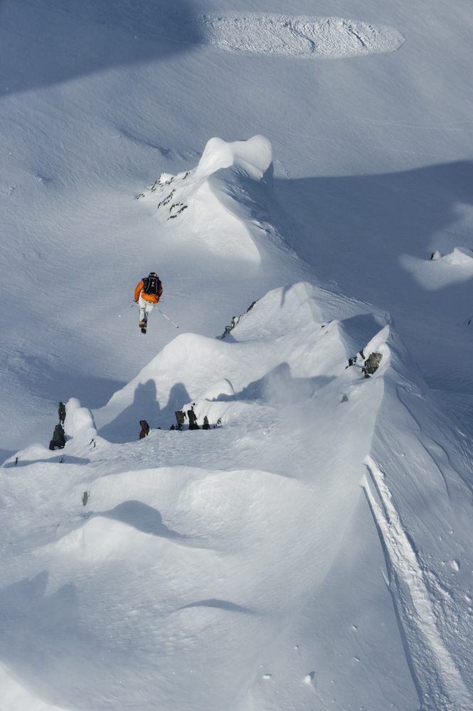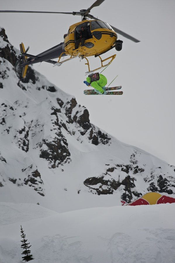 Throw on top of the multimedia team, then there’s a small handful of photographers and writers, organized and moved about by a crew of mountain guides, cat drivers and helicopter pilots, not to mention the Red Bull girls, and deep in the middle of nowhere, with skiers like Sean Petit throwing huge 60-foot 360s into soft, sunny snow, and it all seems to be going to plan. Especially for Karl.