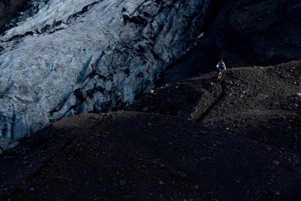 It just so happens that about six months ago, I rode my bike to the base of the glacier that once covered the volcano that’s currently erupting in Iceland. I was there with Kona Cadabra ripper Joe Schwartz and photographer Sterling Lorence, doing a story for Bike Magazine. It was a fairly strange day. We thoroughly pissed off this German dude hanging in a little camper truck. We were making too much noise apparently. He drove off all mad. Then, as we were riding the 3kms or so from the parking lot to the toe of the glacier, on our way to touch 20,000 year old frozen water, we watch a search and rescue helicopter land on the other side of the lake and pluck a hiker who’d fallen and donged their noggen. Then Joe did this crazy shaman ritual thing calling for the fire gods to blow forth their heated guts. (Not quite so forthright). But here’s proof we were right there, a before and after. The big blue ice that silhouettes Regular Joe so nicely in the bottom image is gone like Donkey Kong. It’s been replaced by the big grey wash of the first, taken from a very similar position. Anyway, nice to touch you glacier. And sorry, mister Volcano, that you’re so upset.